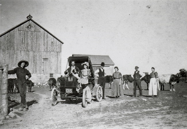 [A black and white photo of a family standing in front of a barn. A couple sits in an early automobile in the center of the image, with the rest of the family members surrounding them in the background.]