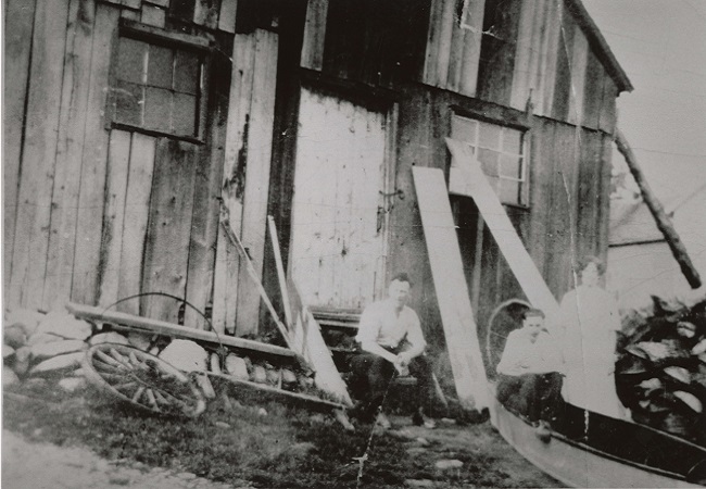[A black and white photo of two men and a lady sitting in front of a blacksmith shop. Carriage wheels and ply wood lean against the exterior of the blacksmith shop.]